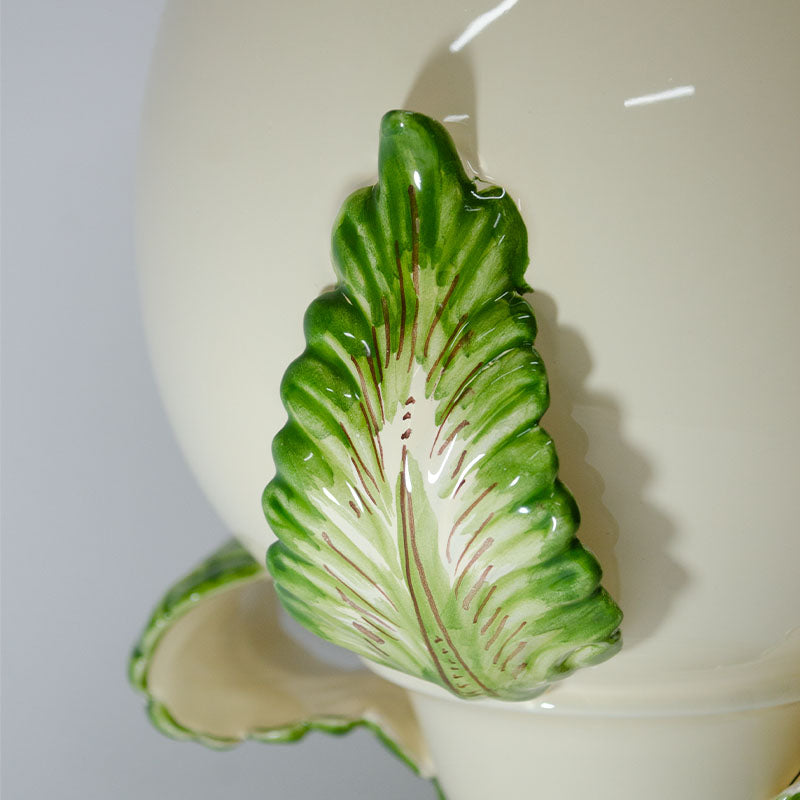 Pumo Grottagliese a quattro foglie, due delle quali applicate al livello della base, di colore bianco e verde . Ogni singolo prodotto viene realizzato a mano con cura e passione. Se il prodotto non è disponibile, contattaci e provvederemo alla realizzazione su richiesta.