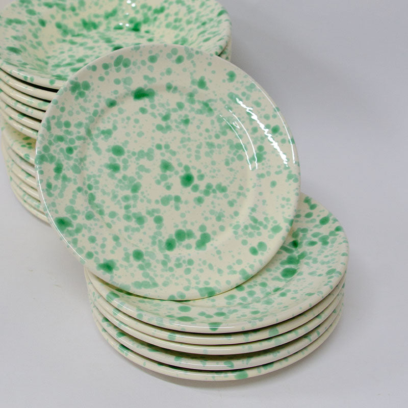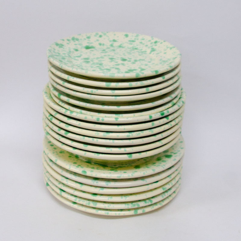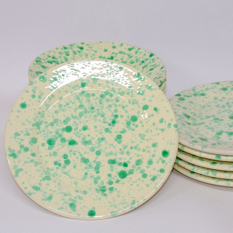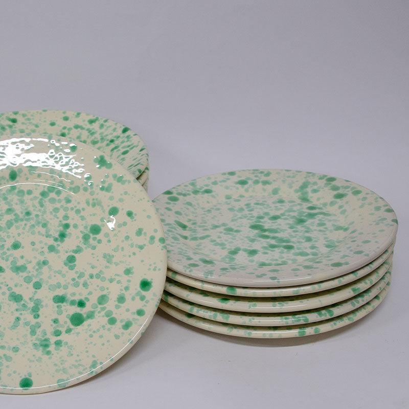 SET Piatti Bicolore , decorato a mano con schizzi di colore, Bianco e Verde. Il SET comprende: 6 Piatti fondi da 23 cm; 6 piatti piani da 20 cm; 6 piatti piani da frutta da 15 cm. Perfetti per ogni occasione. Ogni singolo prodotto viene realizzato a mano con cura e passione. Se il prodotto non è disponibile, contattaci e provvederemo alla realizzazione su richiesta.