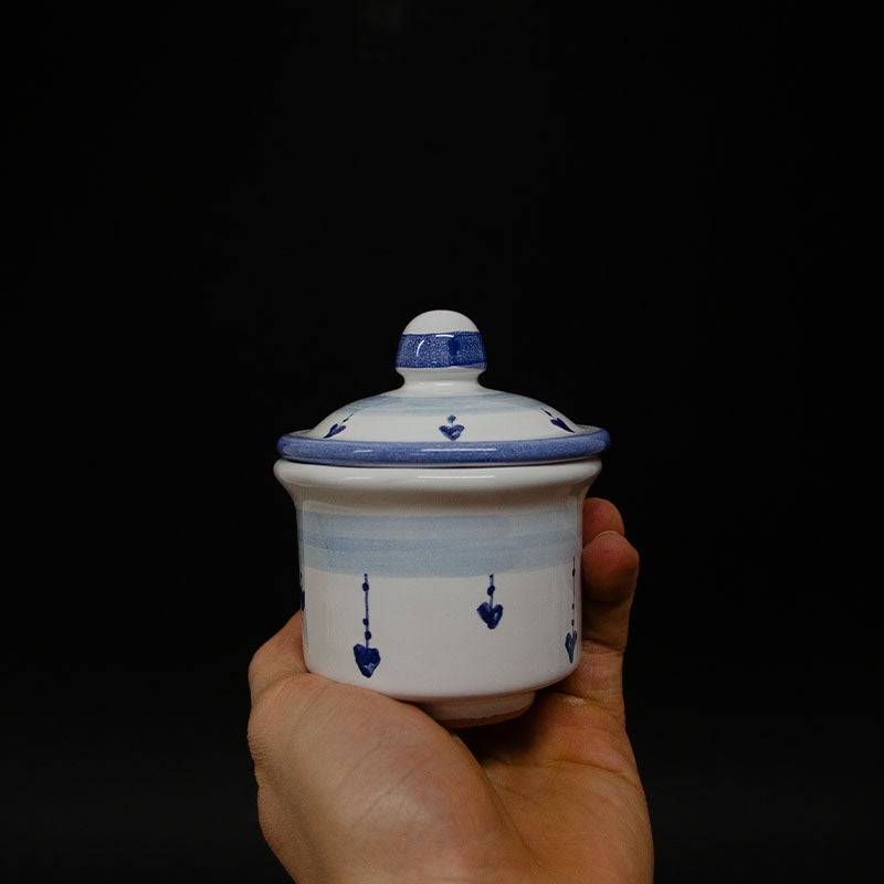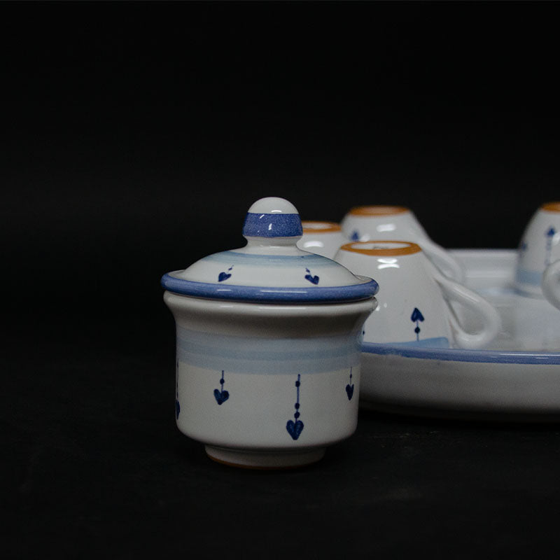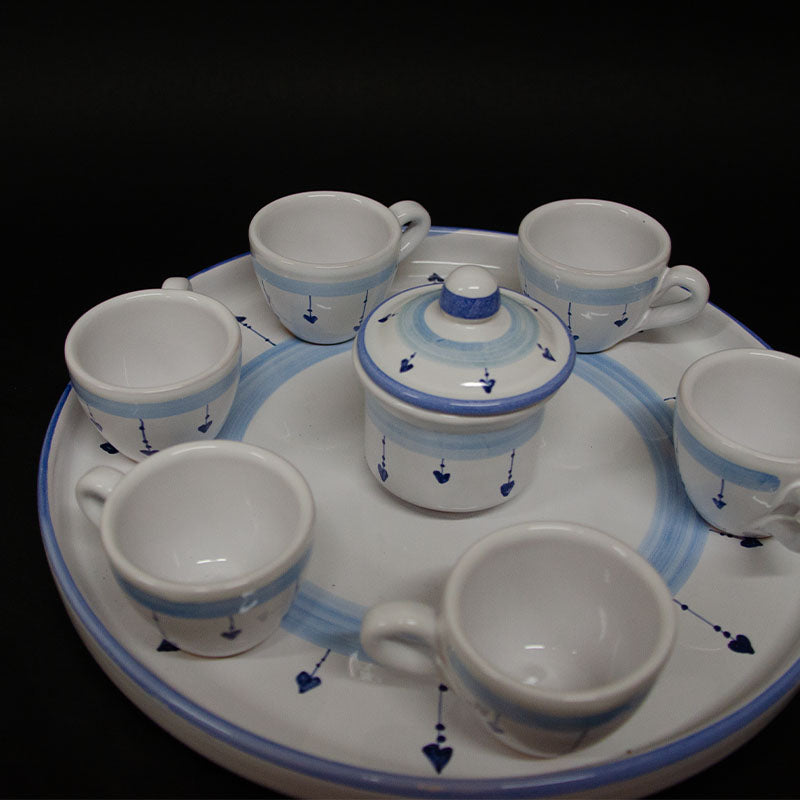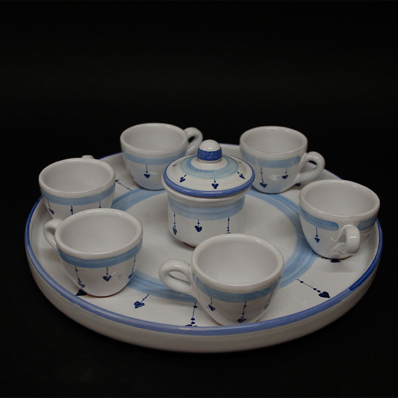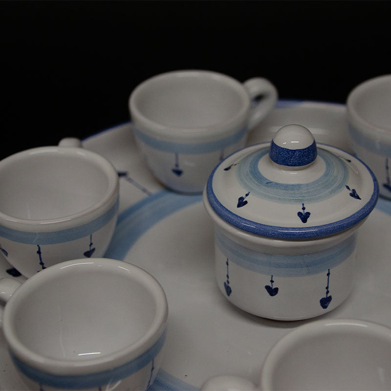 SET Tazzine, Piatto e Zuccheriera, decorata a mano di colore bianco e blu. Perfetto per i caffè in compagnia. Ogni singolo prodotto viene realizzato a mano con cura e passione. Se il prodotto non è disponibile, contattaci e provvederemo alla realizzazione su richiesta.