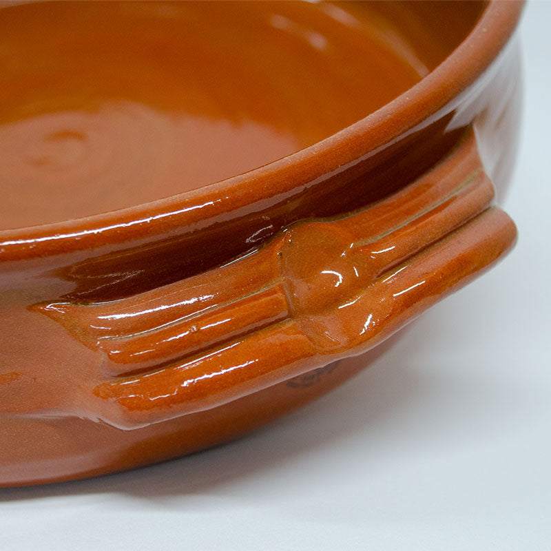 Tegame Grottagliese con manici, di colore rosso. Questo Tegame è realizzato con argilla pirofila per consentire all'utente di cuocere adeguatamente ogni singolo pasto. Per poter essere utilizzato correttamente, essa deve riscaldarsi correttamente pere vitare possibili danni all'oggetto. Ogni singolo prodotto viene realizzato a mano con cura e passione. Se il prodotto non è disponibile, contattaci e provvederemo alla realizzazione su richiesta.